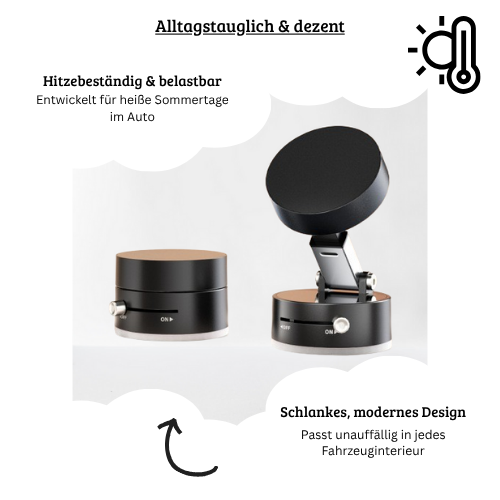 Die Halterung wurde für den Einsatz im Fahrzeug entwickelt und bleibt in der Regel auch bei höheren Temperaturen stabil. Dennoch kann extreme Hitze (z. B. direkte Sonneneinstrahlung bei über 50 °C im Innenraum) in seltenen Fällen die Haftung beeinträchtigen. Eine regelmäßige Reinigung der Fläche sorgt für besseren Halt.